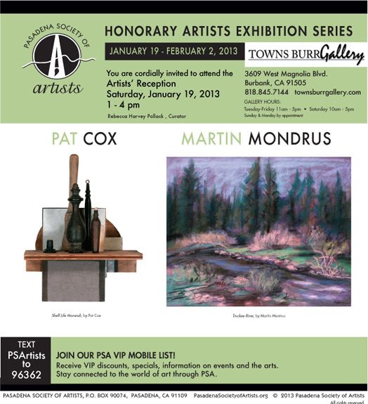 Please mark your calendars and plan on joining us to honor two of our long-time members Pat Cox and Martin Mondrus in the second of our Honorary Artists Exhibition Series, featuring a retrospective of their work.