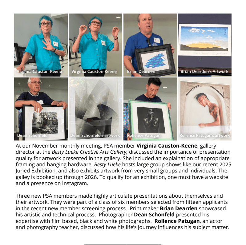 At our November monthly meeting, PSA member Virginia Causton-Keene, gallery director at the Besty Lueke Creative Arts Gallery, discussed the importance of presentation quality for artwork presented in the gallery. She included an explaination of appropriate framing and hanging hardware. Besty Lueke hosts large group shows like our recent 2025 Juried Exhibition, and also exhibits artwork from very small groups and individuals. The galley is booked up through 2026. To qualify for an exhibition, one must have a website and a presence on Instagram.