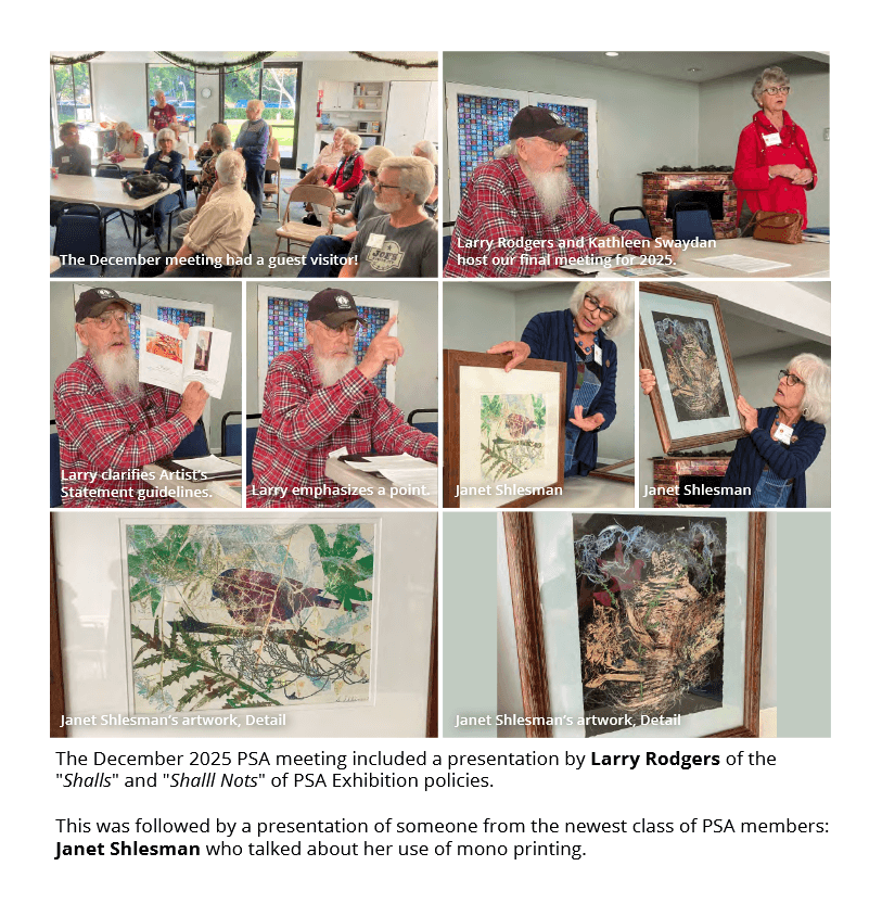 The December 2025 PSA meeting included a presentation by Larry Rodgers of the "Shalls" and "Shalll Nots" of PSA Exhibition policies.