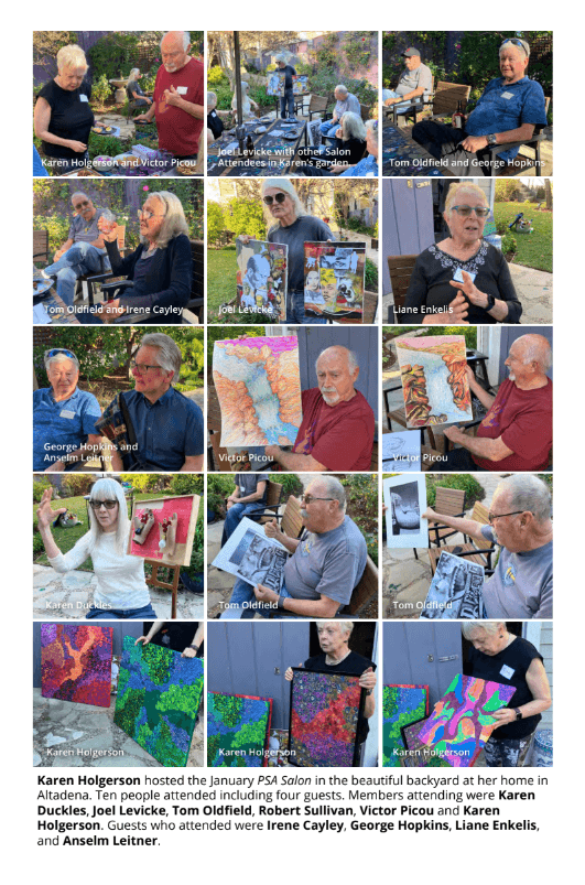 Karen Holgerson hosted the January PSA Salon in the beautiful backyard at her home in Altadena. Ten people attended including four guests. Members attending were Karen Duckles, Joel Levicke, Tom Oldfield, Robert Sullivan, Victor Picou and Karen Holgerson. Guests who attended were Irene Cayley, George Hopkins, Liane Enkelis, and Anselm Leitner.
