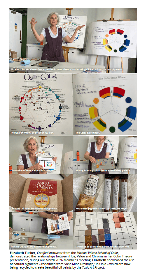Elizabeth Tucker, Certified Instructor from the Michael Wilcox School of Color, demonstrated the relationships between Hue, Value and Chroma in her Color Theory presentation, during our March 2026 Member’s meeting. Elizabeth showcased the use of natural pigments – reclaimed from “Acid Mine Drainage,” in Ohio – which are now being recycled to create beautiful oil paints by the Toxic Art Project